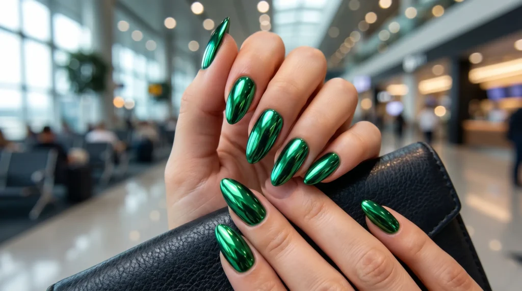 Green chrome nails are the new metallics. A reflective, almost liquid emerald finish that catches every ray of light in the room. The shape makes it wearable, but the finish is 100 percent showstopper. This is the design for bold moods.