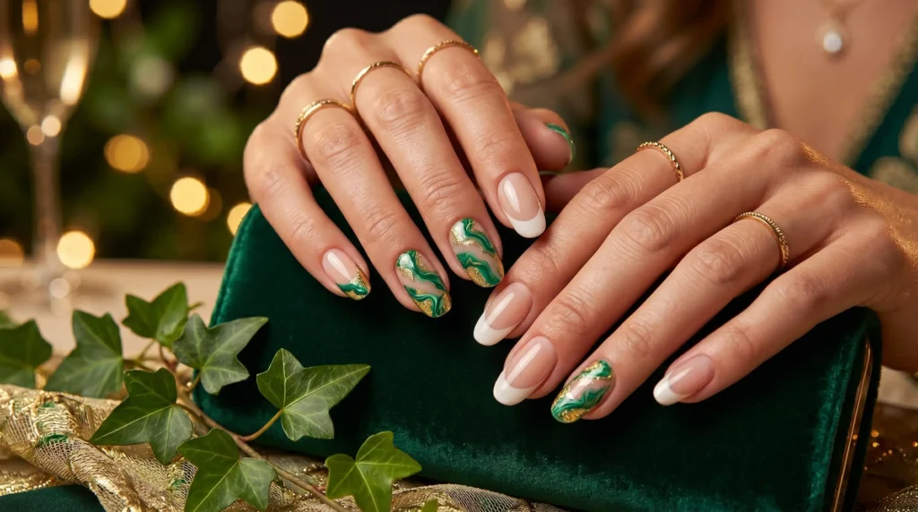 This is the nail design for a party, a winter wedding, an evening event where your hands need to feel dressed. The combination of nude French, emerald marble, and gold detail is genuinely hard to improve.
