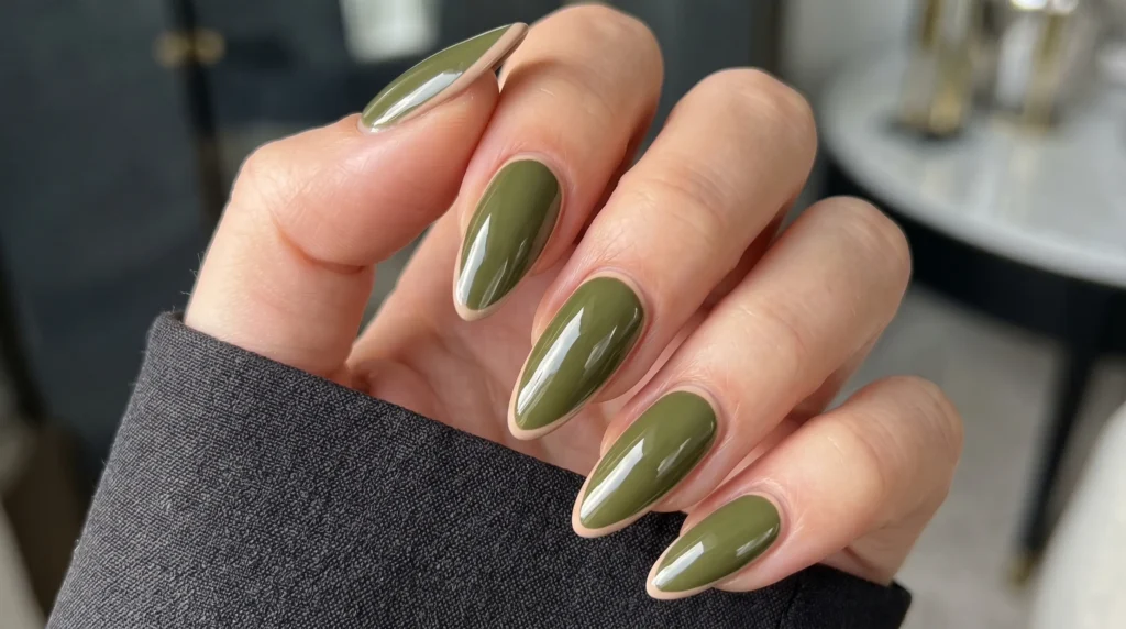 Glossy olive green on most nails, with an ultra-thin nude contour line creating the illusion of even longer, more elegant fingers. Clean, sharp, and somehow simultaneously retro and very current. The accuracy of the outline shape gives it a graphic quality that reads wearable — not a design that shouts, but the silent swagger of someone completely sure of their own taste.