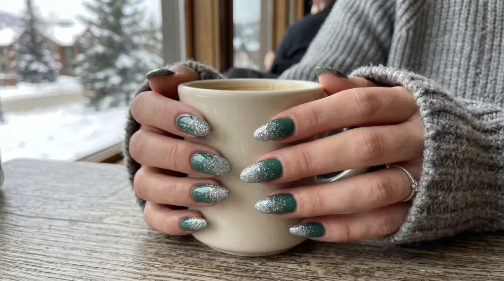 Rich spruce green base transitioning into a glitter-gathered fade at the tips — like frost settling on the ends of the nails. Festive without being too much, and genuinely wearable well past December. The almond shape makes the glitter even more striking by stretching the sparkle along a longer surface.