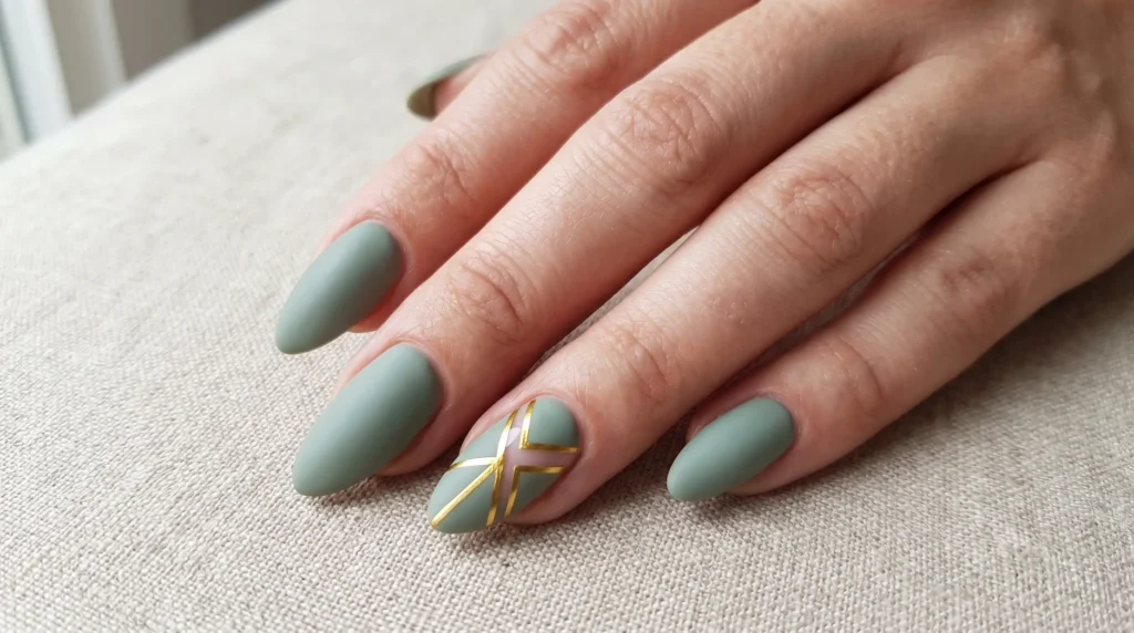 Muted matte sage green on most nails, with a modern geometric design on the accent nail — negative space and metallic gold striping tape creating angular lines over the green. Not a dressed-up mani, but a calculated, artistic one. Almond shape, elegant as ever.