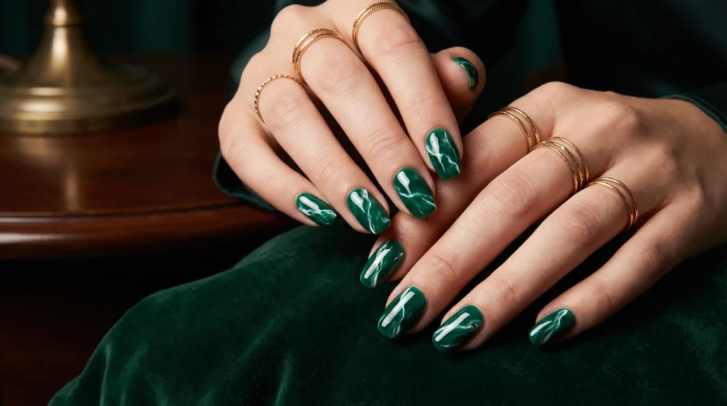 Marble nail art continues to be one of the most artistic manicure trends, and green marble in particular feels genuinely sophisticated in 2026. The glass-like finish makes the color appear incredibly rich — almost jewel-like when light touches the surface. Blogger and editorial trend lists alike are highlighting jade marble specifically as a high-interest 2026 direction.