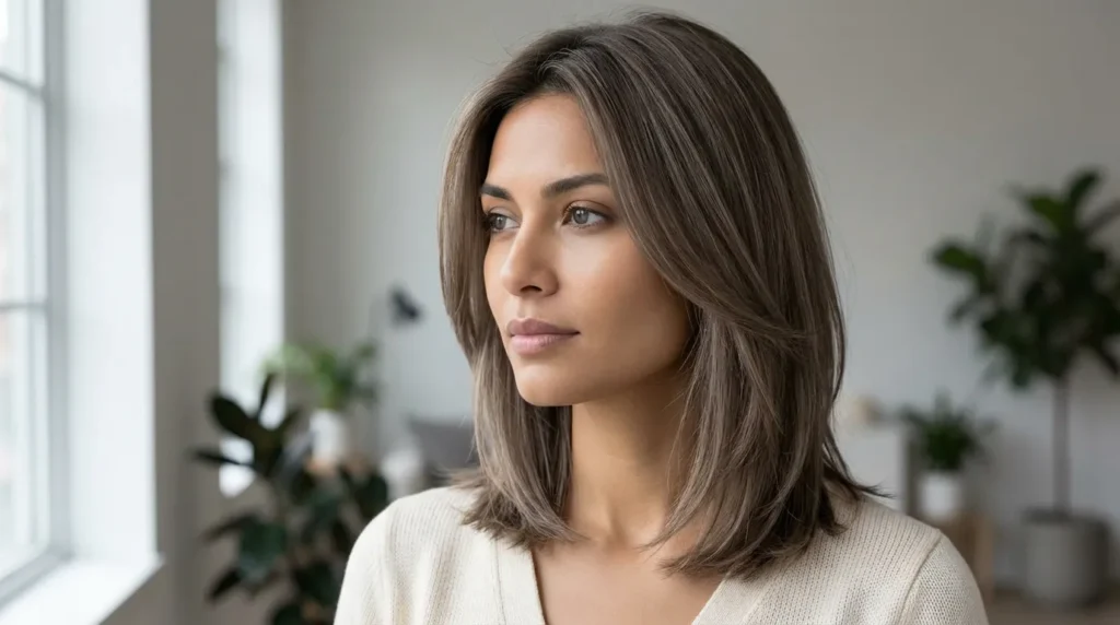 Now here’s where it gets interesting. Ash brown might seem counterintuitive for warm olive skin, but trust me on this one.
