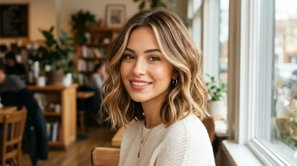Somewhere between blonde and brunette — and that’s honestly where the magic is. The face-framing pieces go brighter, while the rest stays a soft, blended brunette. Warm, dimensional, incredibly flattering.