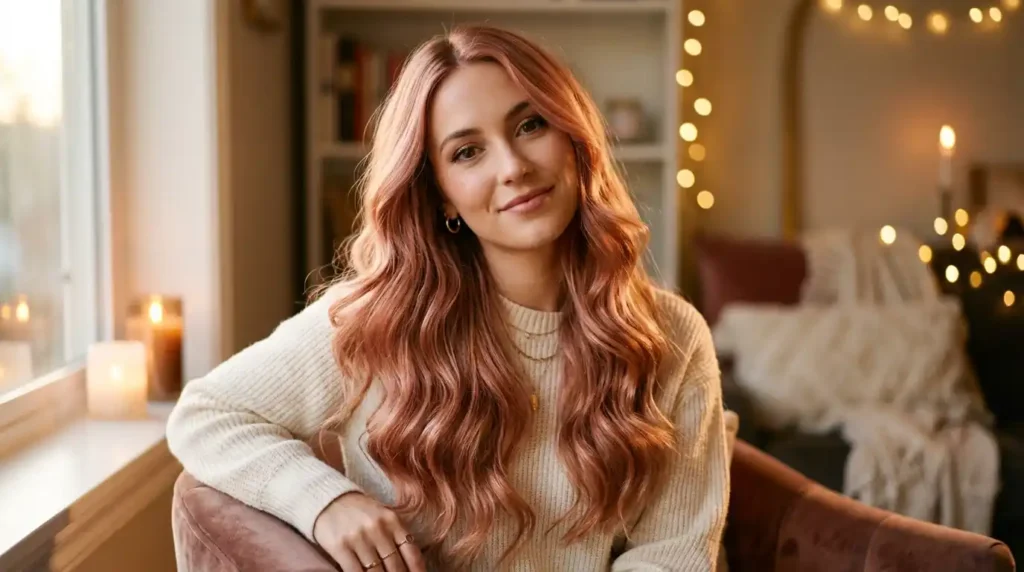 Warm pink meets golden undertones for a true rose gold balayage moment. Long, flowing, styled into sculpted waves that reflect light at every turn. It doesn’t blend in, but it doesn’t shout either.