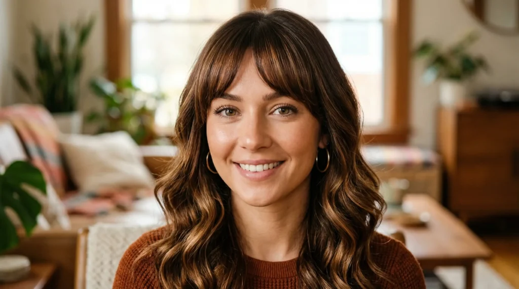 Rich, copper-kissed brunette that lights up toward the ends — paired with a curtain fringe that’s longer and more mature than the versions you remember from a few years ago. The fringe runs a long line down the center of the forehead, which is genuinely slimming on rounder face shapes.