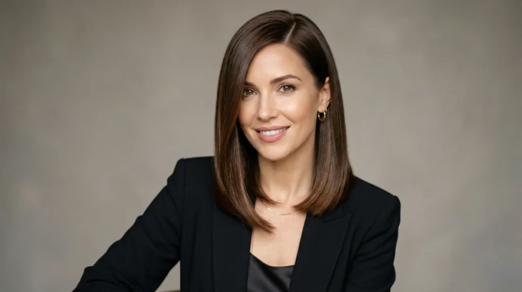 Sleek but not flat. An angled lob with a soft side part — front pieces longer than the back, grazing the collarbone, with a slightly shorter back that creates natural volume. The length at the front does the slimming work; the shorter back lifts everything.