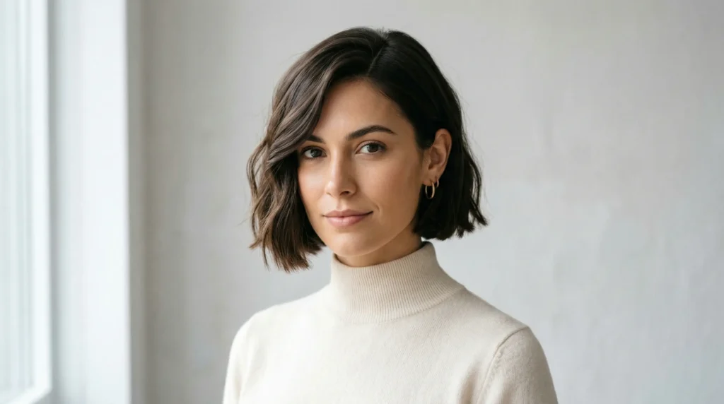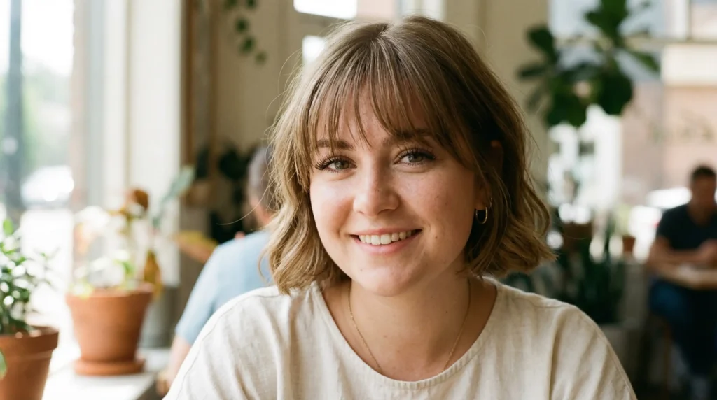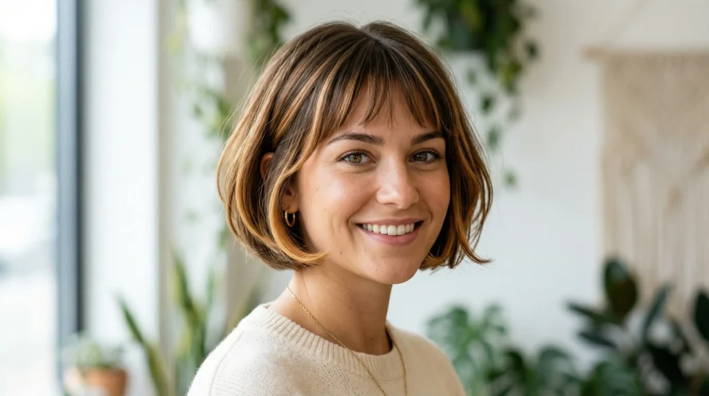 You might be worried that going short will make a round face look wider. Here’s what actually happens: with internal layering and light bangs placed correctly, a bob like this gives the face shape. It creates structure where there wasn’t any.