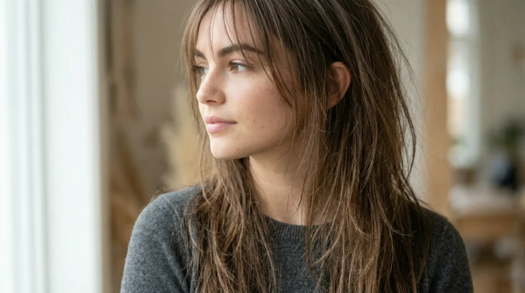 This is the unexpected one — and it earns its place. A long shag with intentional, lived-in texture and micro curtain bangs so feathered they barely register as a fringe. That’s exactly what makes them genius.