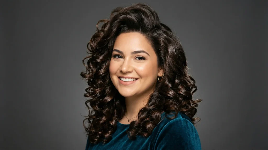 Okay, we need to talk about this one. Sculpted curls with a voluminous silhouette that still flatters a round face. The layers are arranged to build height at the crown rather than width at the cheeks, and the side part does its slimming work beautifully.