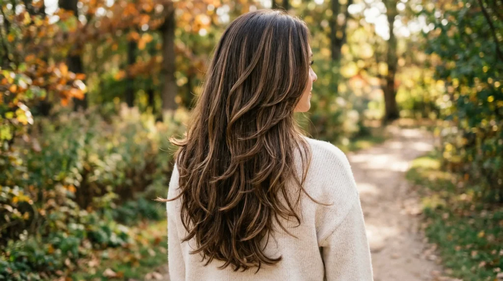 Cozy, warm, and quietly dramatic. Deep mocha with gentle caramel ribbons, cut into long sweeping layers that fall well below the chin. Those layers pull the face downward — creating the illusion of length — while the slightly flipped ends add a modern touch that feels current without trying too hard.