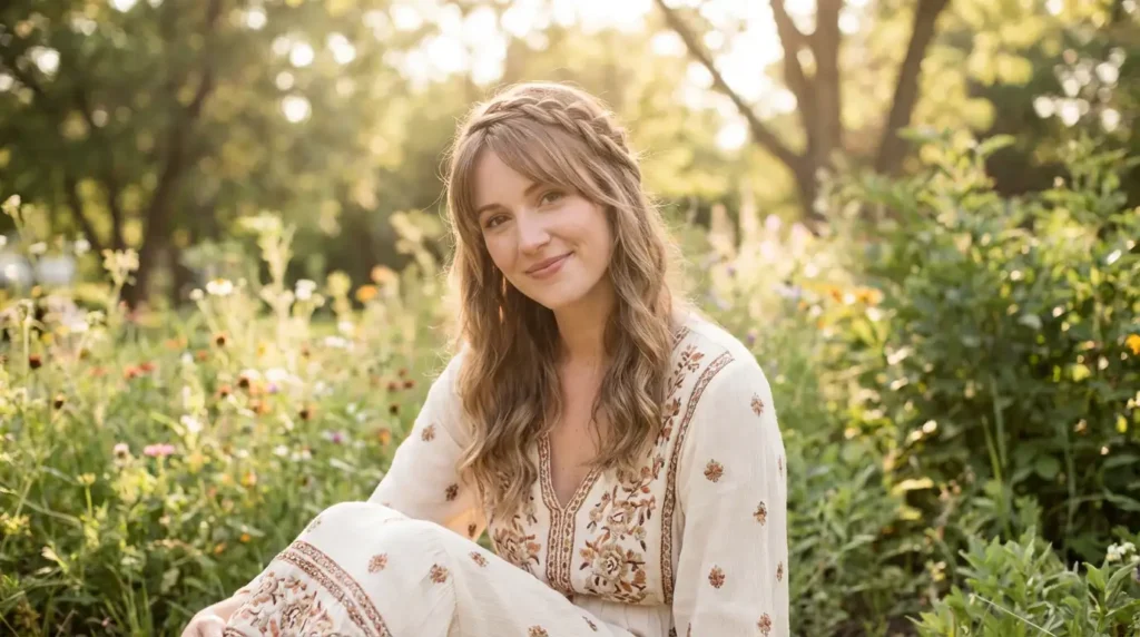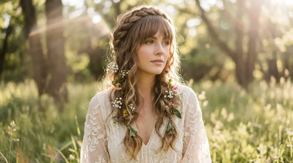 This whimsical style incorporates your bangs into a soft, romantic braid that wraps around your head. It’s giving festival vibes in the best way.