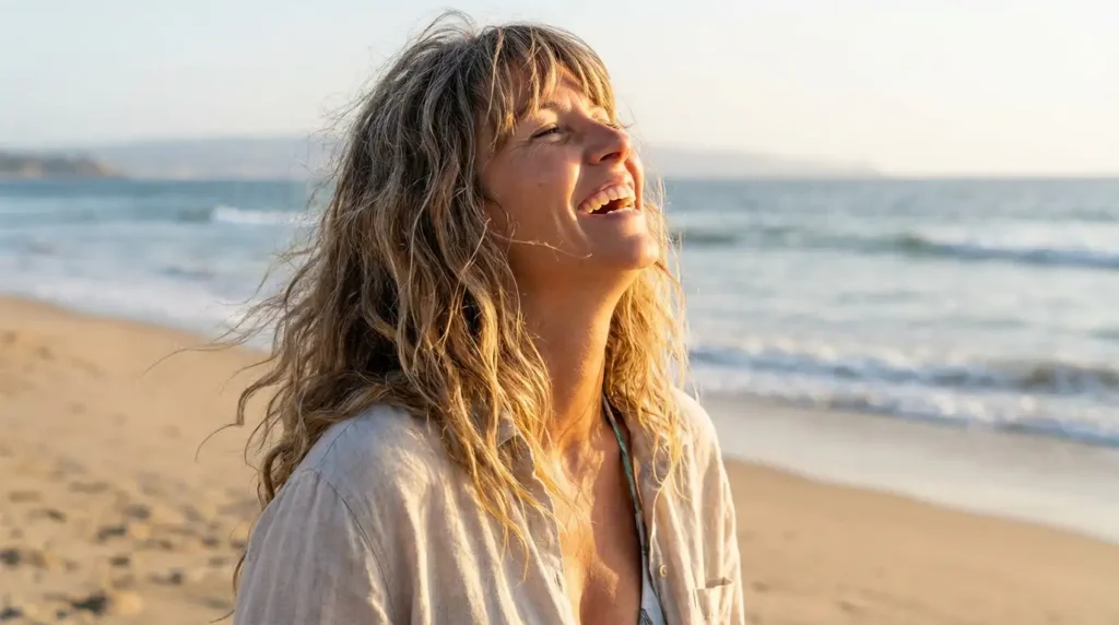 Part your hair down the middle or slightly off-center—whatever feels natural to you. Apply sea salt spray to damp hair, scrunching it in for texture. Let it air dry if you’ve got time, or use a diffuser if you’re in a hurry.