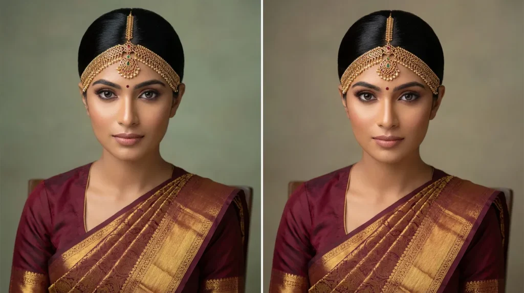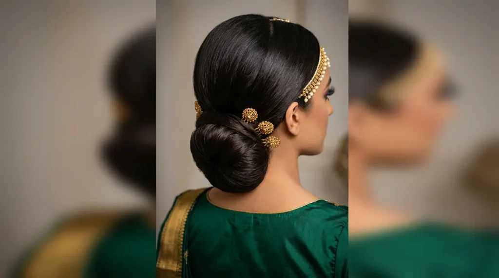 This timeless hairstyle for Indian weddings is pure elegance. The hair is parted perfectly down the middle and pulled into a tight, glossy bun. The matha patti sits across your forehead like a crown. It’s especially stunning with heavy silk sarees and traditional jewelry.
