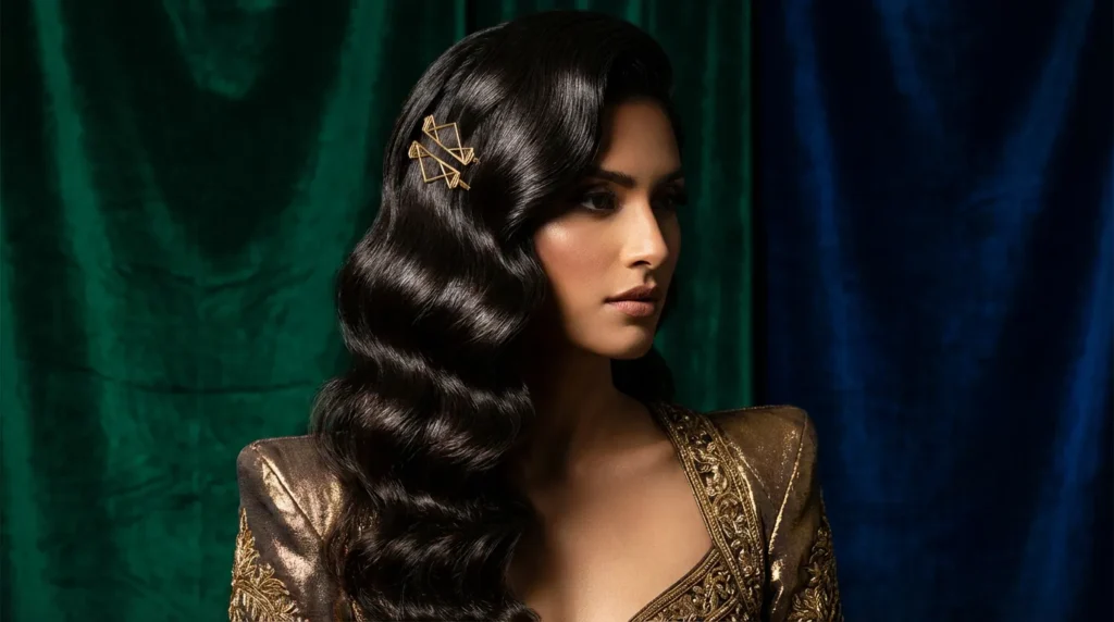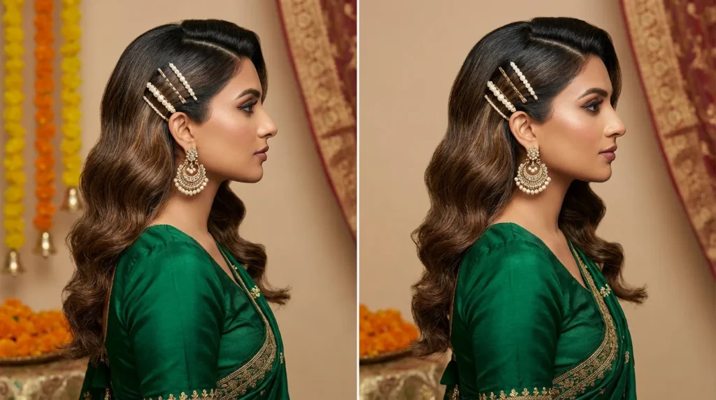 This is my go-to recommendation for reception parties. The glossy, side-swept waves scream elegance without competing with the bride. Add pearl clips on one side, and you’re golden. This hairstyle for Indian weddings works with sarees, lehengas, or Indo-western outfits.