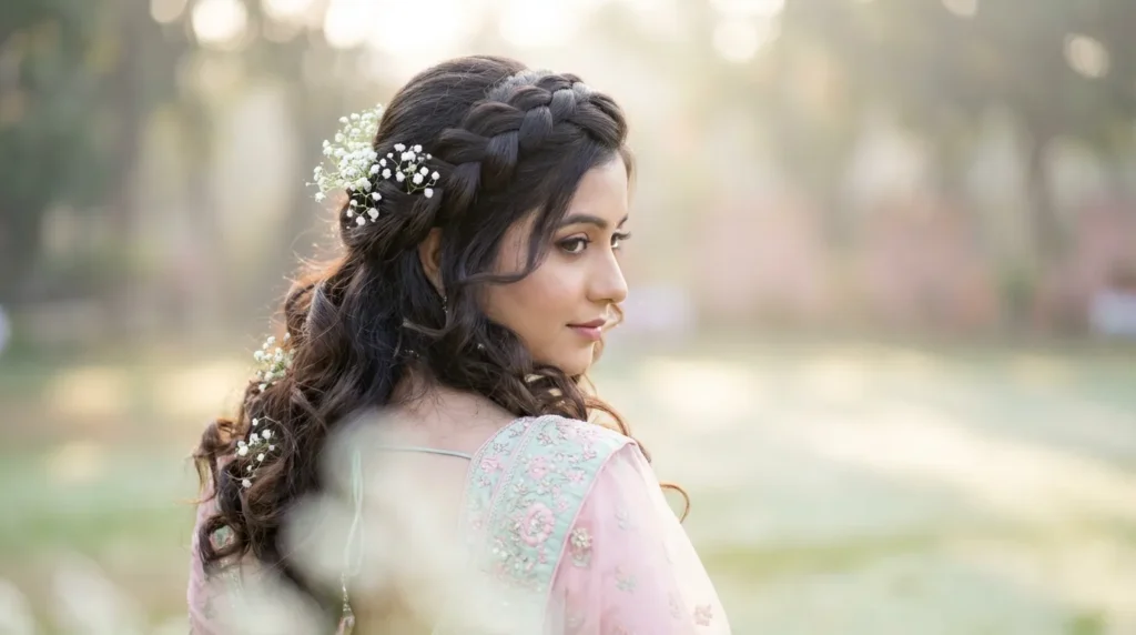 A braid wraps around your head like a crown, while the rest of your hair falls in loose, romantic curls. This combines the structure of braiding with the softness of flowing hair—one of the most versatile hairstyles for Indian weddings.