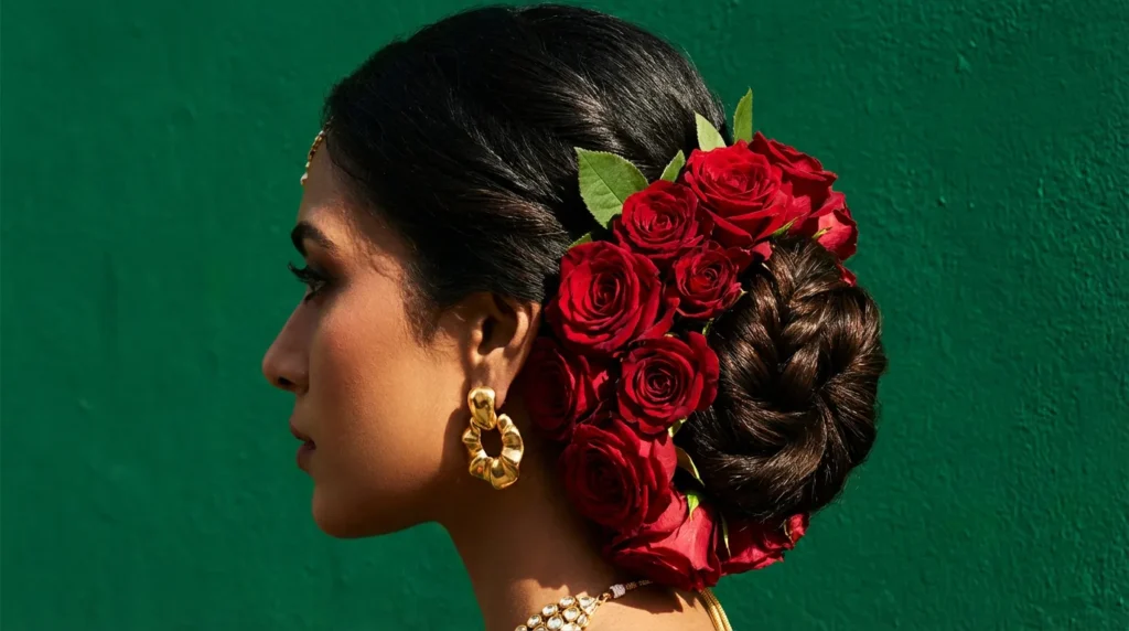 The hair is twisted from one side and secured into a low bun, then decorated with large red roses or other vibrant flowers. This asymmetrical Indian wedding hairstyle is modern yet traditional, perfect for brides who want something different.