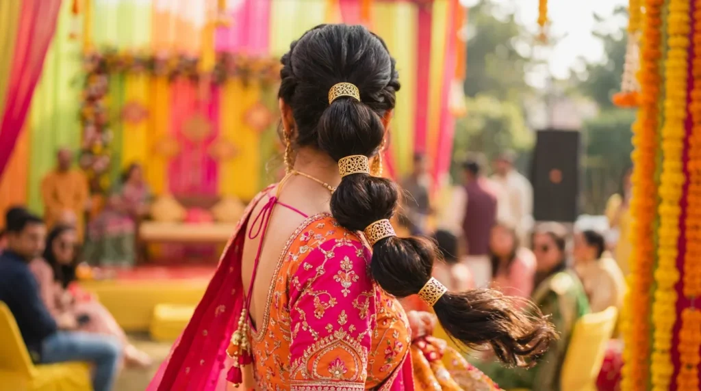 Now here’s a fun one! The bubble ponytail creates sections down the length of your hair using gold or silver cuffs. It’s playful, unique, and ideal for mehendi or sangeet functions when you want a hairstyle for Indian weddings that stands out.