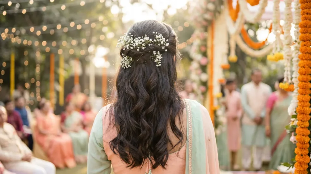 The top section is twisted and pinned back, while the bottom half flows in soft waves. Delicate baby’s breath flowers are tucked throughout for a dreamy, romantic vibe. This Indian wedding hairstyle is perfect for bridesmaids.