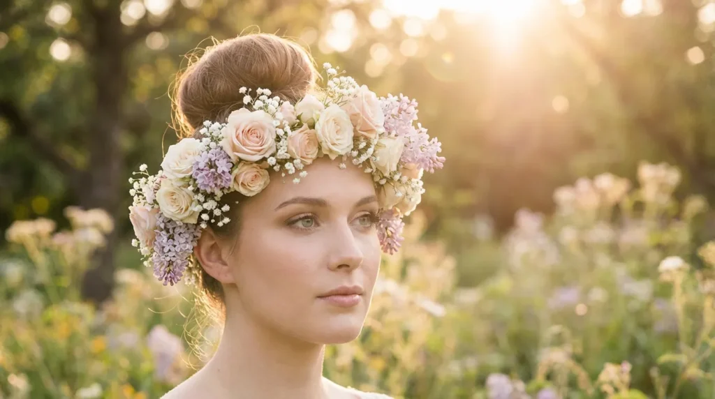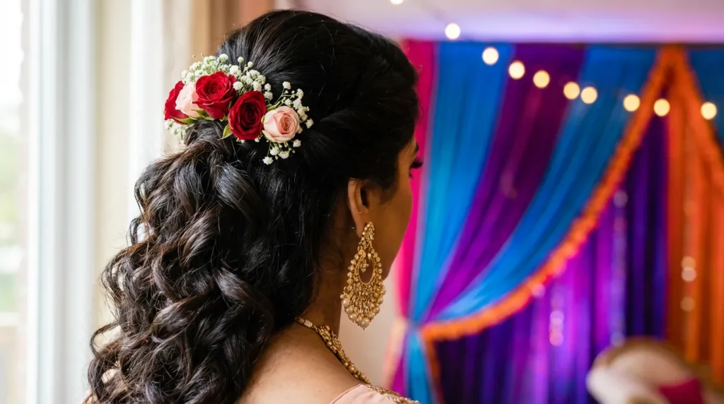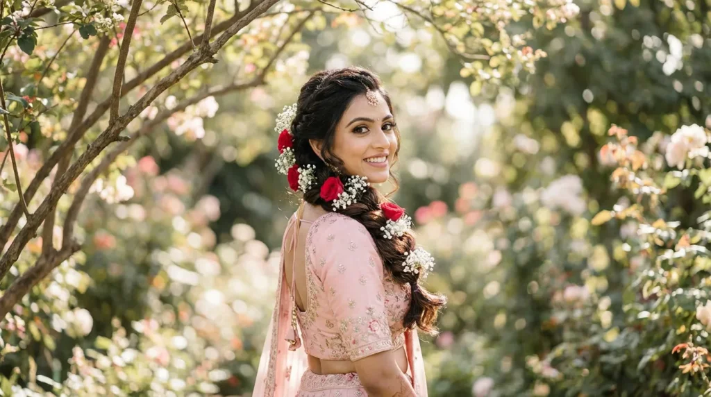 A high bun wrapped with a crown of mixed flowers—roses, baby’s breath, and lilacs—creates a goddess-like appearance. It’s regal, feminine, and one of the most photographed hairstyles for Indian weddings.