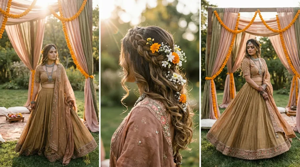 - Mehndi ceremony – Go playful with loose braids, floral crowns, and colorful accessories