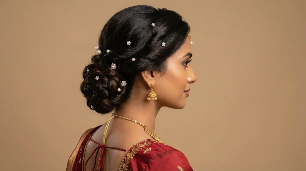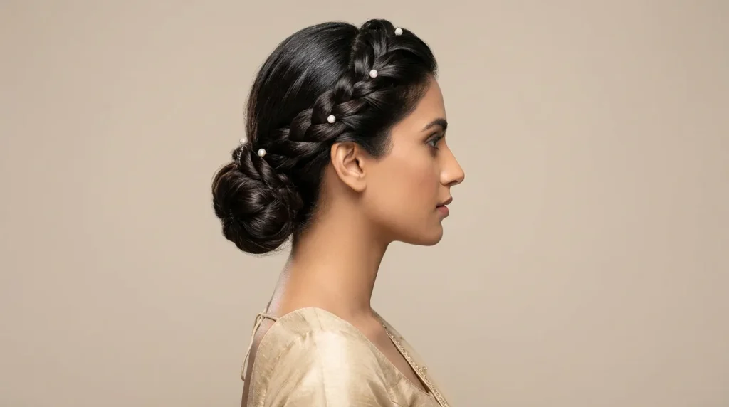 Here’s a variation on the classic bun. Instead of a simple pull-back, the hair is twisted from both sides and secured into a low bun at the back. This adds texture and detail while maintaining that traditional elegance that hairstyles for Indian weddings are known for.