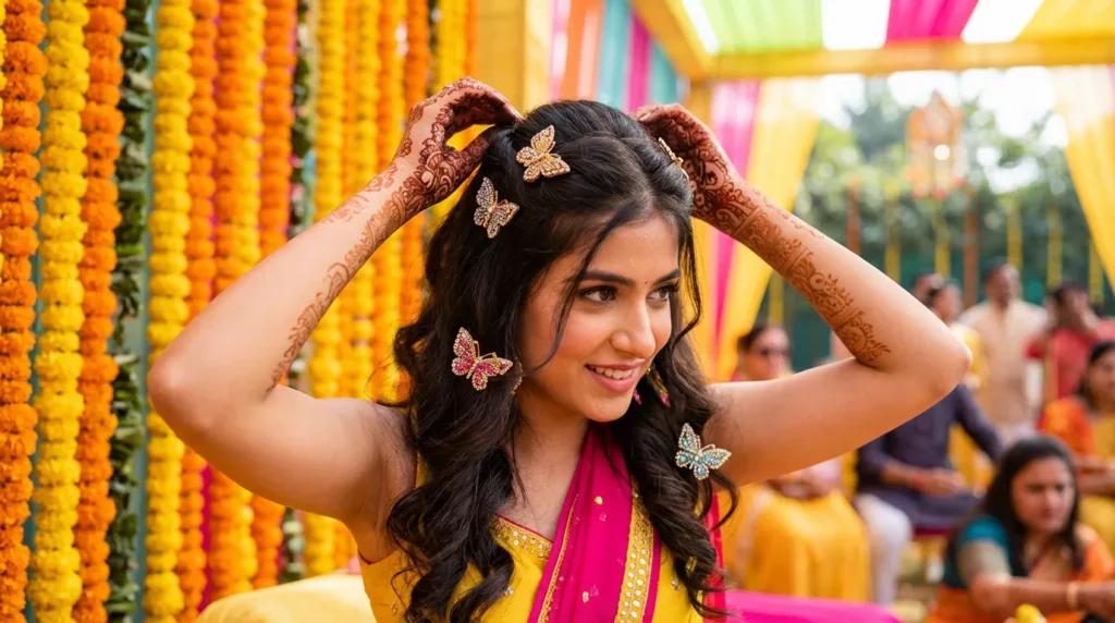 Soft curls are pulled back with playful butterfly clips scattered throughout. This whimsical hairstyle for Indian weddings is ideal for mehendi functions when you want to look festive and fun.