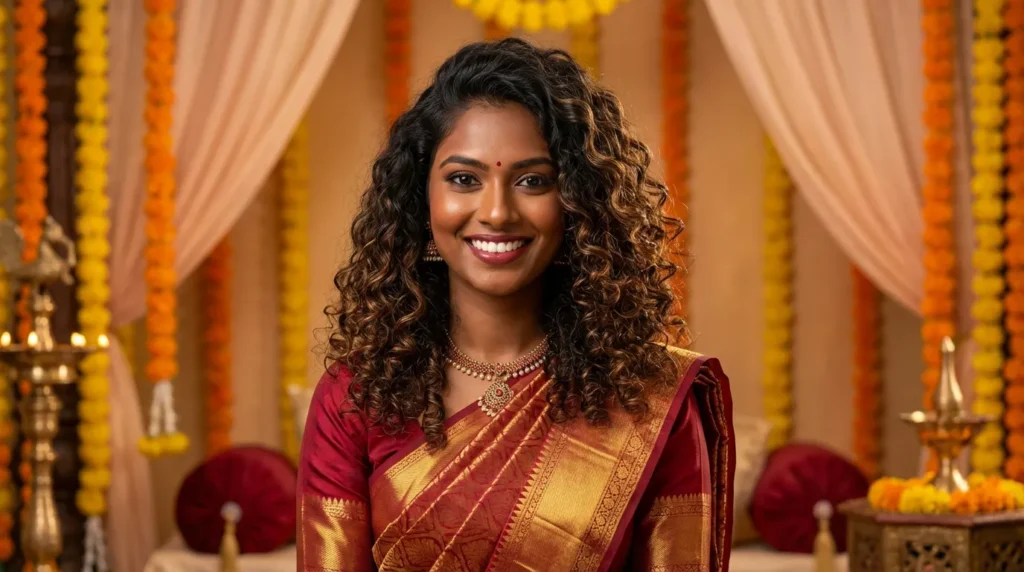 Sometimes the best Indian wedding hairstyle is just letting your natural texture shine. A deep side part with well-defined, voluminous curls looks stunning with traditional sarees. Use good products to control frizz, and you’re set.