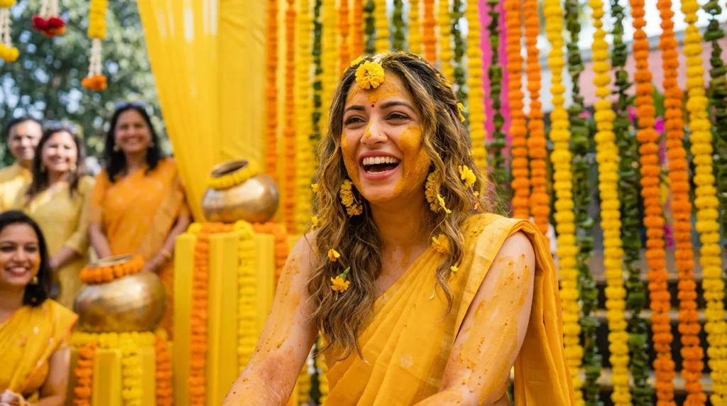 - Haldi function – Keep it simple with natural textures and fresh flowers