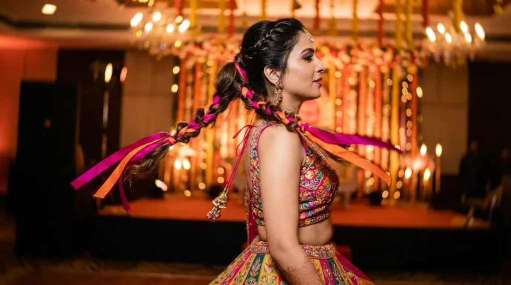 A side ponytail with a braid running through it and colorful ribbons woven in brings playful charm. It’s perfect for sangeet night when you’ll be dancing and want your hair secure but stylish.