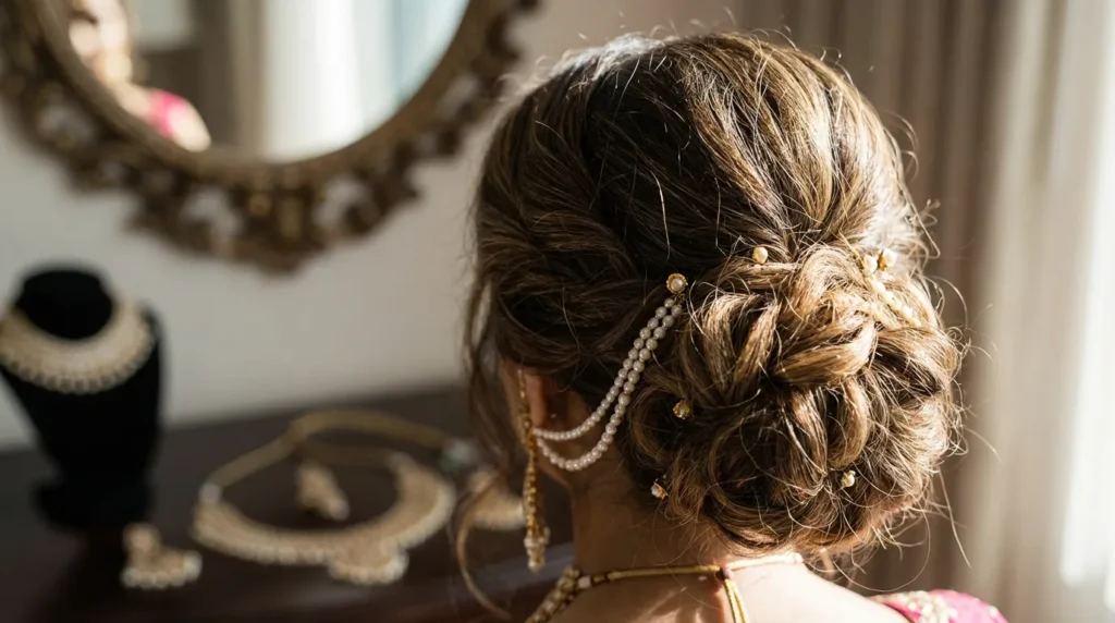 A loosely gathered bun with pearl strings draped through it creates dimension and sparkle. This Indian wedding hairstyle is elegant enough for formal events but comfortable for long celebrations.