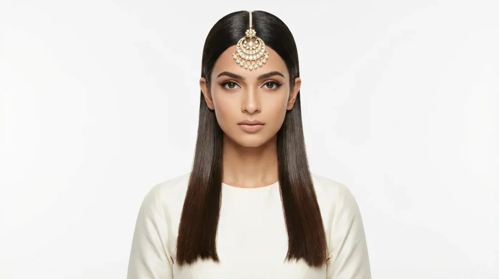 Ultra-straight, glossy hair with a center part lets a dramatic maang tikka be the star. This minimalist hairstyle for Indian weddings works beautifully with contemporary lehengas or fusion wear.