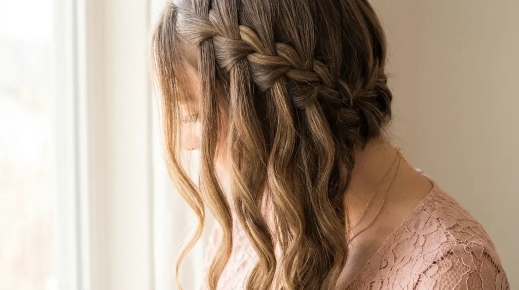 The waterfall braid cascades down one side while hair falls in soft waves. It’s intricate without being too formal—perfect for Indian wedding guests who want something special.