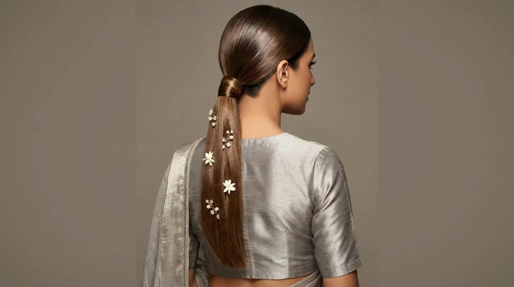 A sleek low ponytail with the base wrapped in either your own hair or decorative fabric creates clean sophistication. Add small flowers or jeweled pins down the length for that Indian wedding flair.
