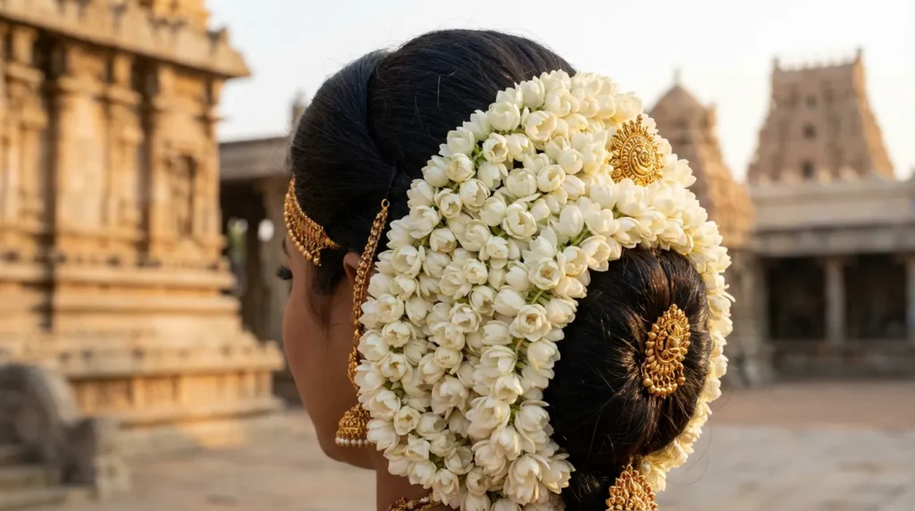 The classic South Indian juda never goes out of style. This low bun is wrapped with strings of fragrant gajra (jasmine flowers), creating that authentic bridal look. The scent alone makes this one of my favorite Indian wedding hairstyles.