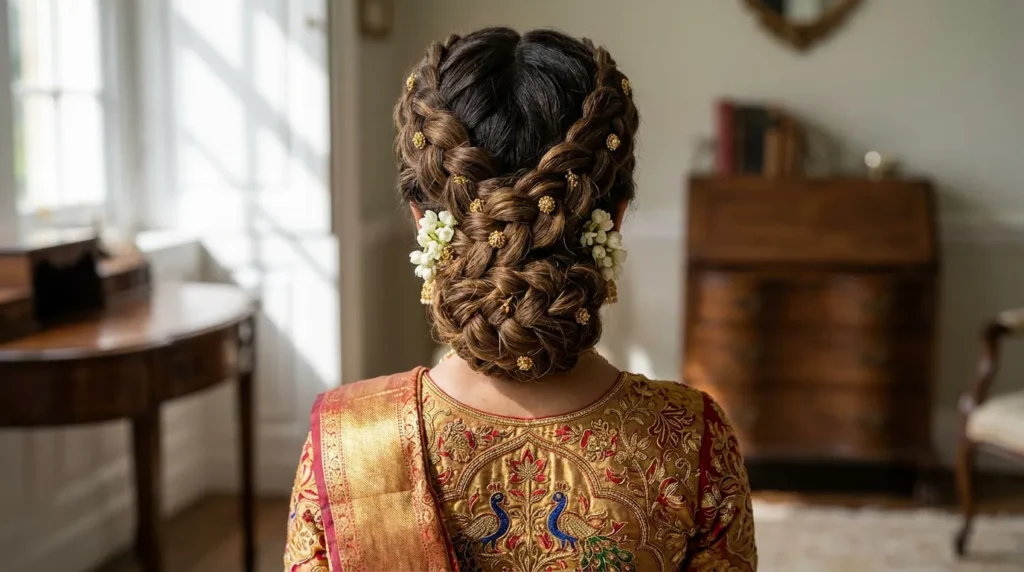 Two thick braids are crossed and pinned at the back to create a crown effect. This intricate Indian wedding hairstyle works beautifully with heavy jewelry and looks stunning from every angle. It’s perfect for brides who want something unique but still traditional.