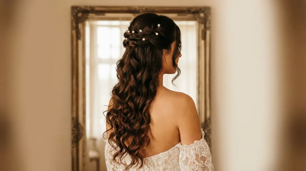 This style gives you the best of both worlds. You get the elegance of an updo at the crown, but those cascading curls down your back add movement and softness. It’s perfect for brides who don’t want to hide their length but still need structure for jewelry placement.