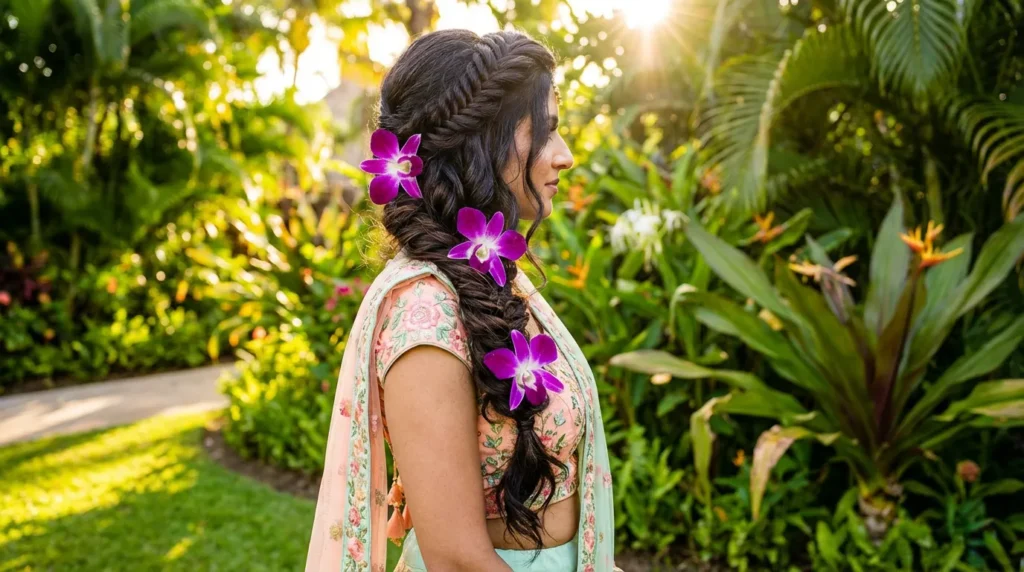 The fishtail braid brings texture and detail, while oversized orchids add that bold, contemporary edge. This hairstyle for Indian weddings works beautifully for brides wearing pastel lehengas or fusion outfits. The intricate weaving of the fishtail looks incredible in photos.