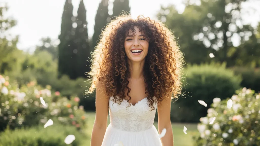 The curls frame your face beautifully and pair effortlessly with strapless dresses. It’s carefree, romantic, and full of personality—perfect for outdoor events or garden weddings where you want to feel both grounded and glowing.