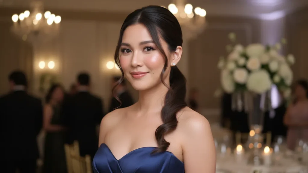 What I love about this style is how it completely shows off your strapless neckline without any distractions. It’s perfect for formal events and stays put all night. Whether you’re walking down the aisle or attending a gala, this hairstyle for strapless dress occasions is timeless and powerful.