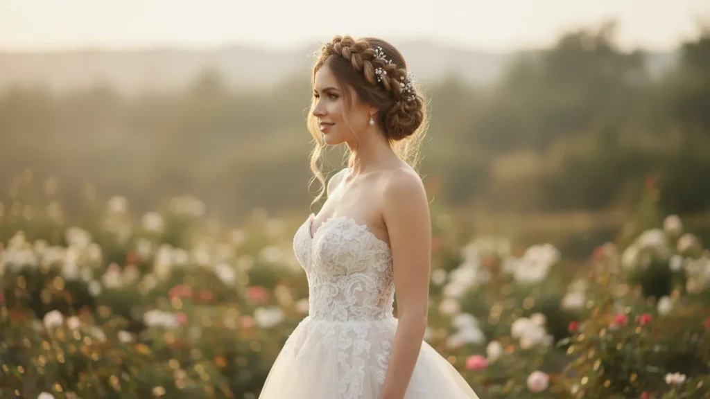 You might be wondering how to make this work—start with a side or crown braid that flows into a low bun at the nape. It’s romantic, unique, and perfect for strapless wedding dresses.
