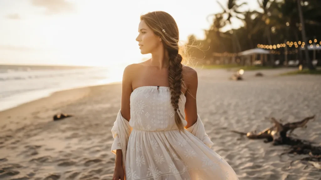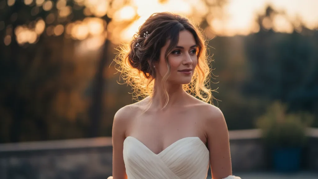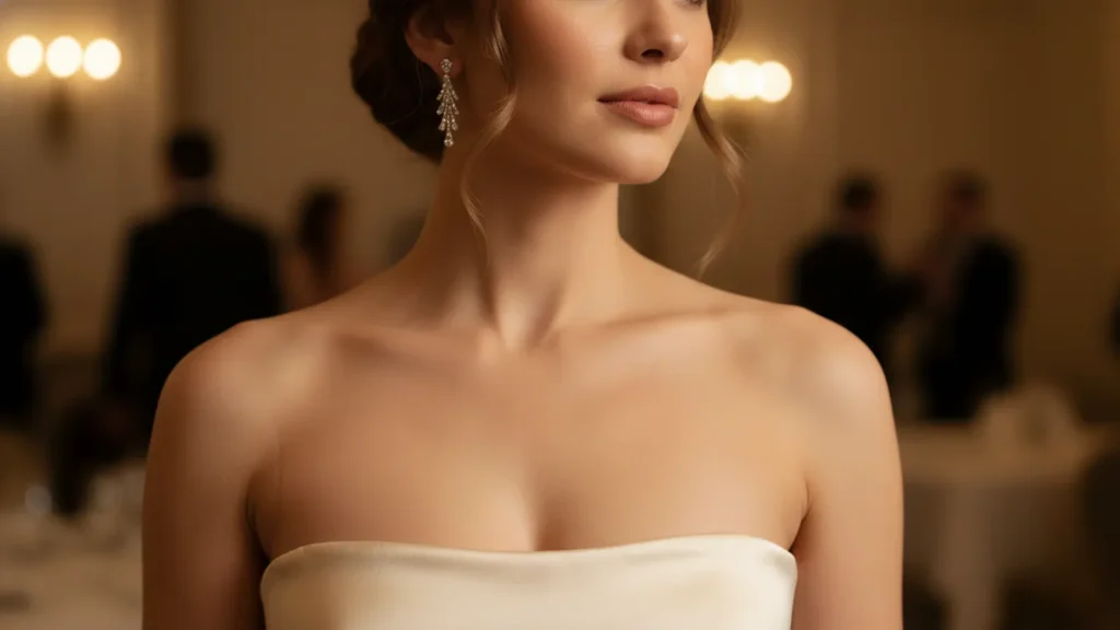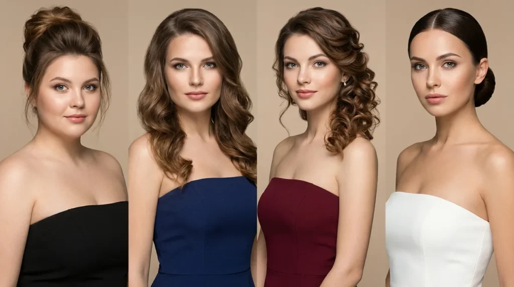 Now here’s where it gets interesting: different hairstyles for strapless dresses work better for different occasions, face shapes, and personal styles. What’s perfect for a summer garden wedding might not work for a black-tie gala.