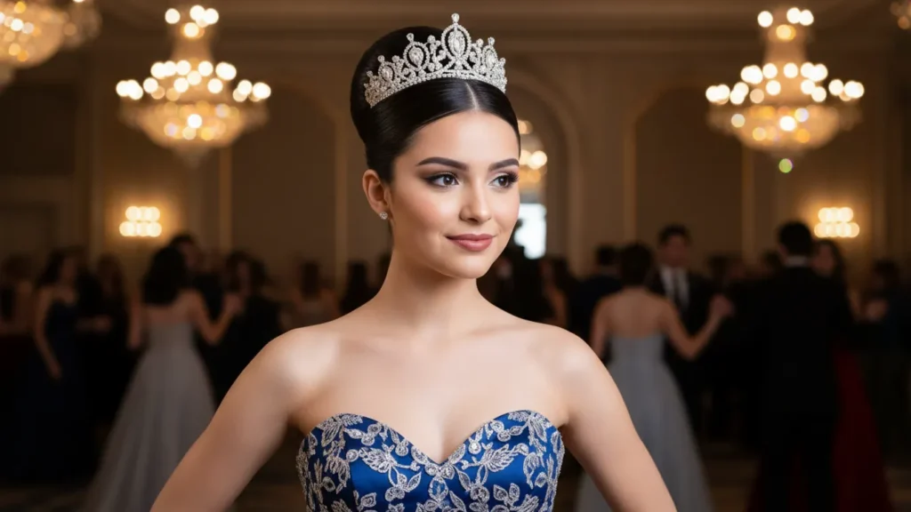 The height of the bun adds drama and elegance, balancing beautifully with strapless formal dresses. Whether it’s your quinceañera or a formal ball, this look is polished, powerful, and straight-up majestic.