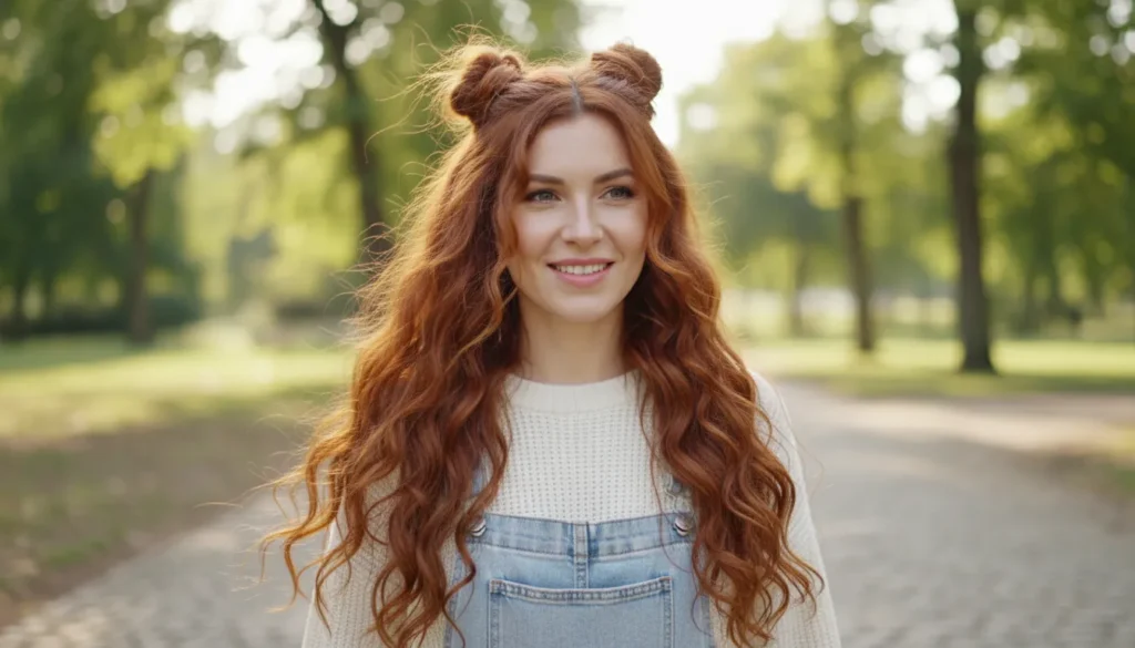 Oh my gosh, this half-up look is so perfect for managing really thick wavy hair while still keeping things fun and playful. Pulling half your hair into two cute mini buns creates instant control at the crown while showing off all that gorgeous length and texture underneath.