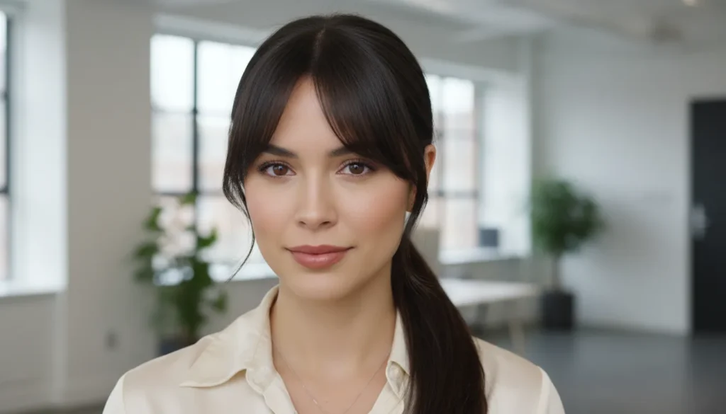 This ponytail feels polished without being too done-up. The loose bangs break things up and frame your face beautifully, while a little texture through the ponytail keeps it from looking stiff or boring.