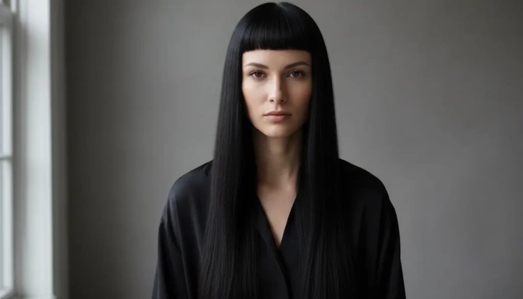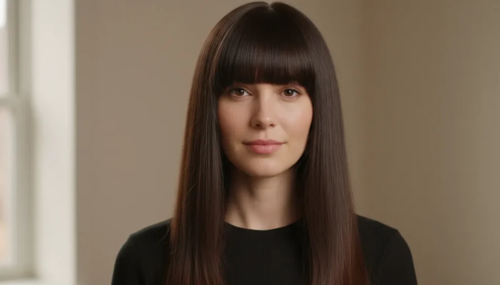 Sharp, straight bangs paired with long hair create this sleek, dramatic look that’s super flattering. The clean fringe keeps all the focus on your face while the length stays smooth and intentional. It’s bold, it’s modern, and it definitely makes a statement.