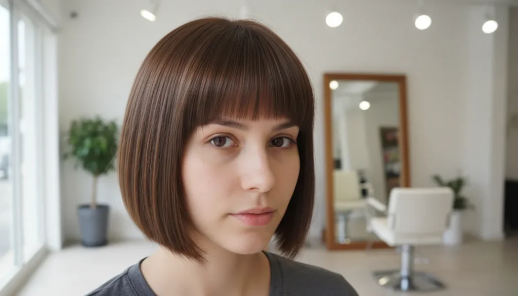 A chin-length bob with full bangs is classic for a reason. It’s one of those hairstyles with bangs that works on pretty much everyone. The straight fringe balances perfectly with the soft volume through the ends, creating a look that’s polished without feeling stiff.