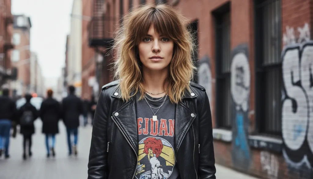 Long layers keep this look wearable and easy, while the bangs bring all the attitude. The fringe hits at just the right spot to frame your face without feeling heavy. Add some sunglasses and you’ve got this cool, retro vibe that feels totally modern.