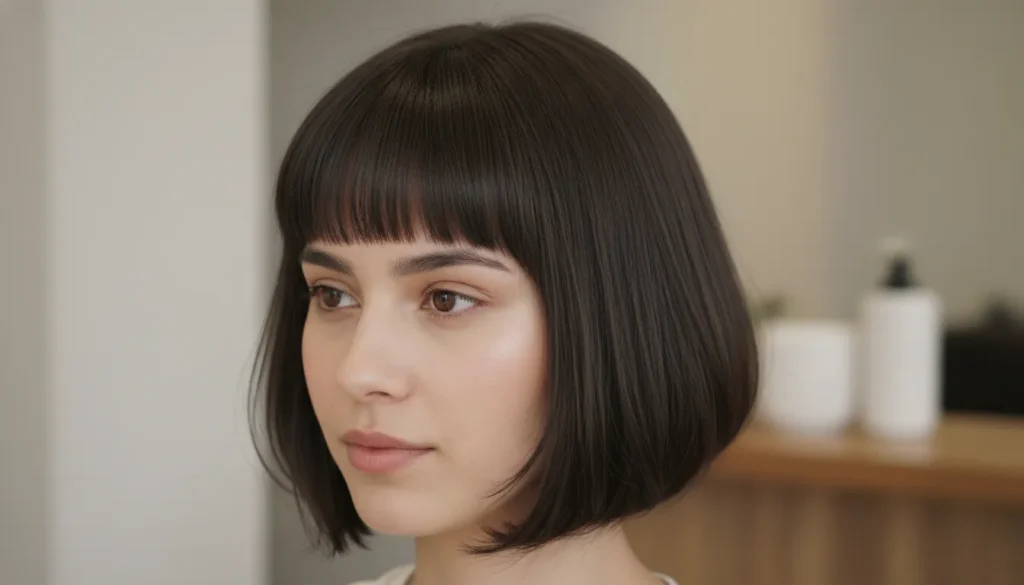 There’s something so timeless about straight blunt bangs with a sleek bob. This look never really goes out of style. The bangs hit right at eyebrow level, creating a bold frame for your face, while the rest of your hair stays polished and structured.