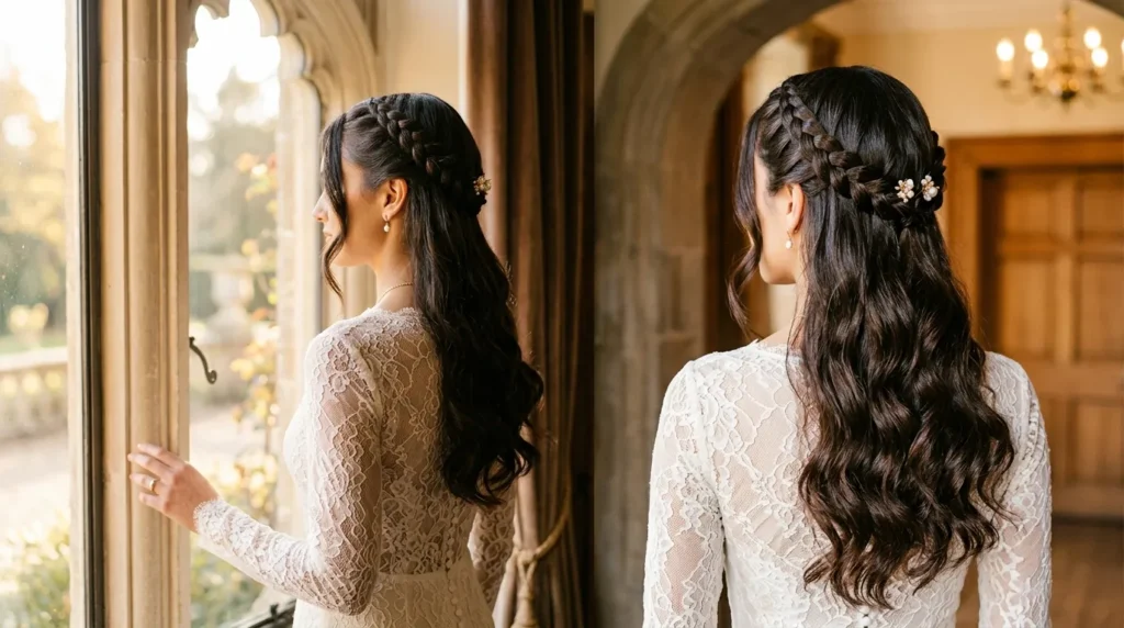 And third, think about your accessories and dress neckline. Half-up styles are particularly versatile here — they work with veils (which pin into the half-up section most naturally), they display earrings beautifully because the upper hair is out of the way, and they suit any neckline from halter through strapless through high-neck without requiring any adjustment to the style itself.